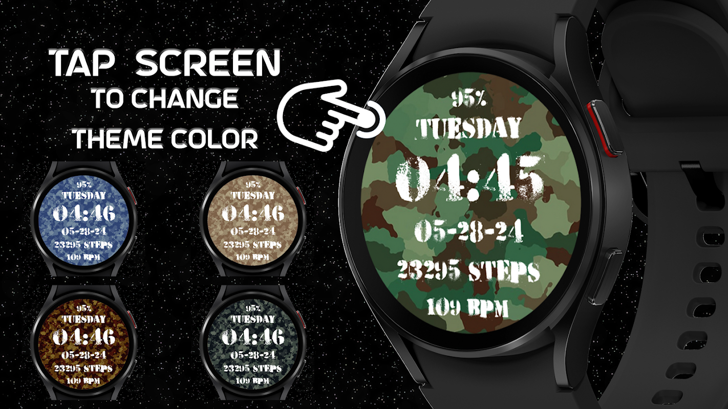 Army Camouflage Soldier-wijzerplaat voor uw Wear OS-smartwatch! Watchface is beschikbaar op apparaten met Wear OS API-niveau 28 en hoger. Alleen Engelse wijzerplaat. Bedankt en geniet ervan!