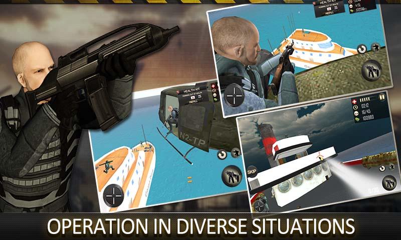 An ex-army commando is on a mission to defend against the terrorist attack on navy ships containing exotic armory. Act as the lone army commando hired on a contract to target & kill terrorists. Infiltrate the threat areas in the cargo ships using different army guns to defeat your enemy. The 3D FPS shooting includes thrilling missions in diverse situations against the terrorist force. Your companion AK-47 will help you dead shot every single enemy. Prove yourself as the brave army commando and challenge enemy with special guns like MK-11, M-16 and HK-33. Apply force and use your army commando skills to improve the shooting experience in the assault shooting. Be an assassin, inflict lethal strikes and use your army commando shooting experience to encounter immense shooting to survive the battle on the ships.