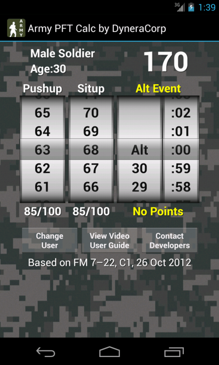 The simplest android-based way to calculate your score on the Army PFT! Use simple wheels to enter your data. Your score is updated instantly. Based upon official Army guidance from Field Manual 7-22, Change 1, dated 26 October 2012, the Army PFT Calculator by Dynera provides accurate results.