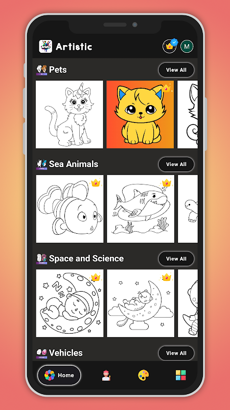 Artistic is een gratis kleurapp met duizenden prachtige en exclusieve kleurafbeeldingen van verschillende categorieën, genres en groepen van gerenommeerde artiesten en illustratoren die je in geen enkele andere kleurapp of kleurboek zult vinden. Je ontdekt innerlijke rust en harmonie door te schilderen op prachtige kleurafbeeldingen, waardoor je de focus en verrijking kunt behouden. Er zijn zoveel gereedschappen en penseelopties waarmee u eenvoudig de gewenste kleurplaten kunt inkleuren. Naast effen kleuren zijn er verschillende andere kleuropties, zoals: u kunt uw kleurpagina vullen met prachtige patronen of inkleuren met verlopen, of uw kleurplaten laten glinsteren met glinsterende kleuren. Je kunt de achtergrond ook vullen met prachtige illustraties om je gekleurde pagina's tevoorschijn te laten komen.