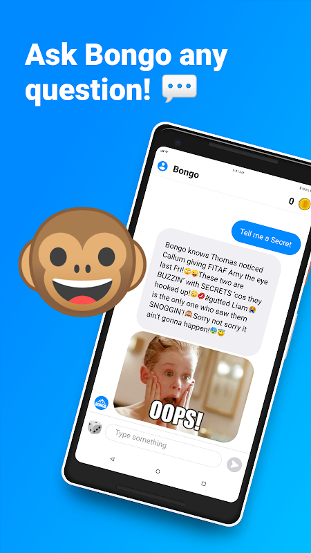 Bongo is a super intelligent monkey from the shores of Borneo, who lives to dish the dirt 24/7! Get an answer to any question anytime! Bongo knows EVERYTHING about EVERYONE!