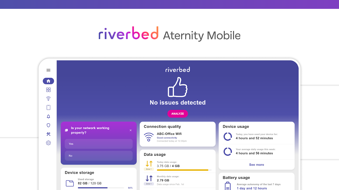 De digitale belevingsoplossing van het Riverbed Platform. Aternity is de digitale ervaringsoplossing van het Riverbed uniforme observatie- en optimalisatieplatform. Riverbed combineert waarneembaarheid voor digitale ervaringen, infrastructuur, netwerk, cloud en applicaties en applicatieversnelling om IT-organisaties te helpen transformatieve verschuivingen in operationele efficiëntie door te voeren met full-stack telemetrie-AI-operaties. Het wordt allemaal mogelijk gemaakt door onze geïntegreerde platformtechnologieën die samenwerken om gegevens uit alle elementen van het IT-landschap vast te leggen. Met de mogelijkheid om gegevensbronnen in één overzicht te integreren, maakt Riverbed het eenvoudig om nauwkeurige antwoorden te geven die de IT draaiende houden.