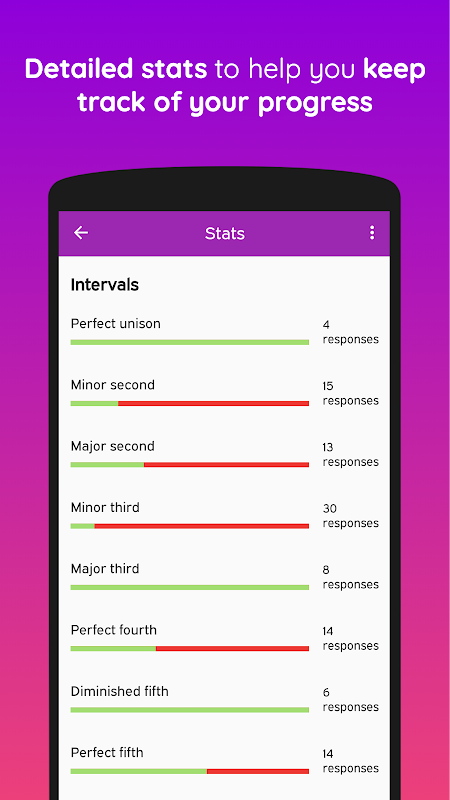 Aural Wiz toont je gedetailleerde statistieken van je voortgang, toont je zwakke punten die je kunt prioriteren om te oefenen. Maak Aural Wiz onderdeel van je dagelijkse auditieve improvisatieroutine.
