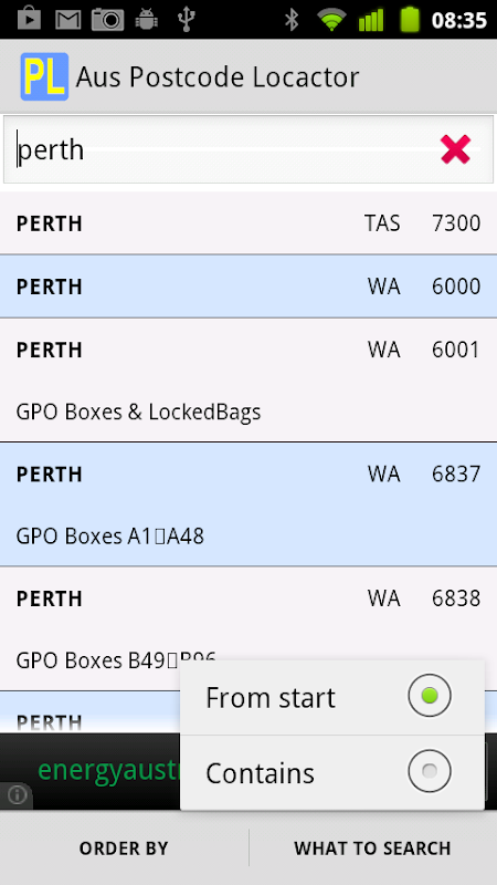 Deze toepassing zal Australische postcodes snel. U kunt zoeken op plaats of postcode. Het kan overal zoeken in een woord. Het zal de resultaten bestellen door plaats, provincie of postcode. De postcode gegevens bijgewerkt maart 2014. Geen internet is vereist voor de toepassing.