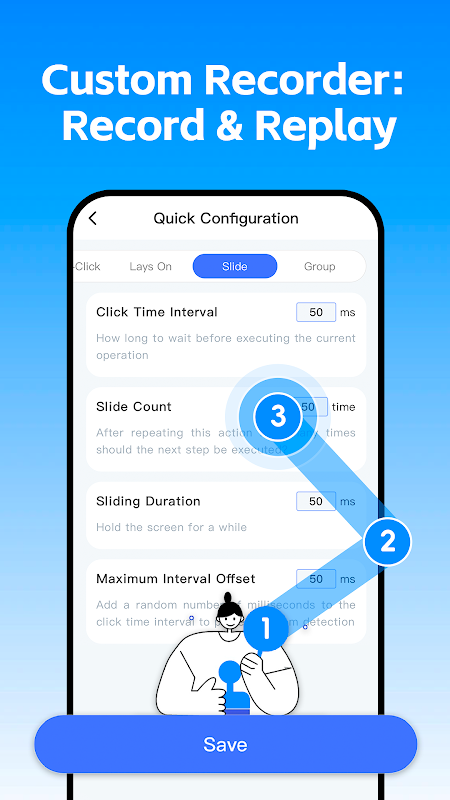 Onze belangrijkste Auto Clicker-functie gaat veel verder dan alleen tikken. Je hebt volledige controle over elk aspect van je klikken. Stel moeiteloos enkele klikken, dubbele klikken en swipes in om complexe acties uit te voeren. Pas belangrijke parameters zoals klikintervallen, duur en aantal lussen aan om aan je exacte behoeften te voldoen. Voor een meer natuurlijke en onopvallende automatisering varieert onze functie voor willekeurige kliklocaties op intelligente wijze tikposities, waardoor menselijk gedrag wordt nagebootst. Deze mate van aanpassing zorgt voor een naadloze integratie met elke applicatie, van mobiele games tot productiviteitstools.
