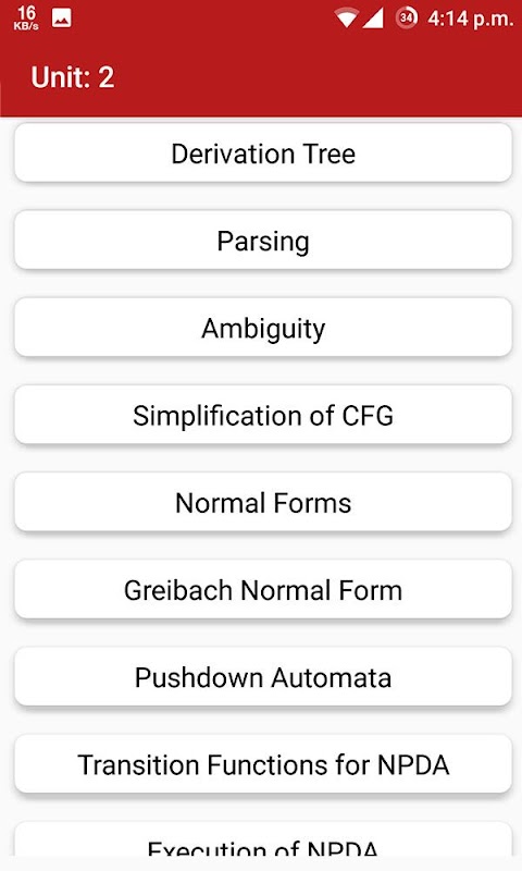 De Automata Theory-app behandelt 138 onderwerpen van Automata in detail. Deze 138 onderwerpen zijn onderverdeeld in 5 units.