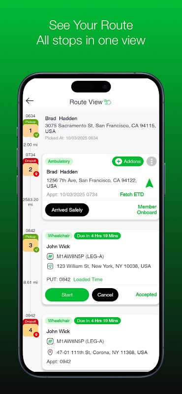 Verhoog de betrouwbaarheid en flexibiliteit van uw NEMT-service. Met actuele informatie over de toewijzing van ritten en operationele updates vanuit het centrale dispatchsysteem kunt u gedetailleerde informatie bekijken, inclusief de speciale behoeften van patiënten, allemaal comfortabel vanaf uw mobiele apparaat.