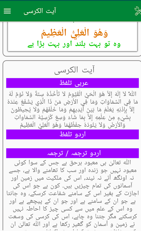 Ayat al Kursi Urdu heeft Arabisch en Urdu ayat ul kursi.