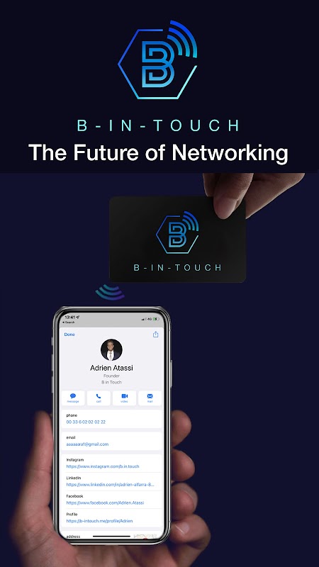 Met een simpele tik op uw B in touch-apparaat of het scannen van uw B in touch QR-code, kunt u direct uw contactgegevens, profielen op sociale media, bestanden, links en meer delen. Bovendien heeft de andere persoon geen app nodig om uw gegevens te ontvangen.