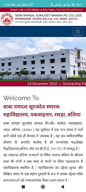 बाबा रामदल सूरजदेव स्मारक पी ० जी ० ० कालेज, पकवाइनार, रसड़ा, बलिया, (उ ० प्र ०) | यह पूर्वांचल में एक मात्र संस्था है जहाँ सभी कोike एक ही ही कैम्पस में उपलब्ध है | यह एक स्ववित्तपोषित योजना के अन्तर्गत कालेज है जो जननायक चन्द्रशेख sne विश्वविद्यालय, बलिया और एन. सी.टी.ई. ई. (NCTE) से सम्बद्ध है | यह लखनऊ बलिया राजमारuction पर स्थित जनपद बलिया के श्रीनाथ बाबा की नगरी व ब्रम्ह बाबा के धरती पर पर पर सर स्थित पकवाइन में महasc waarop महाविद्यालय का उद्देश्य सुन्दर और शिक्षित भारत के एक महान दूरदike के रूप में उनका उदा उद्देश्य गरीब छरीब छरीब छरीब छरीब छरीब छरीब छरीब छरीब छरीब छरीब छरीब छरीब छरीब छरीब छरीब करीब करीब करीब करीब करीब छरीब छरीब करीब करीब करीब करन करन कasc | वह छात्रों को योग्य और ईमर ईमानदार नागरिक में बदलने के लिए अध्यात्मिक, नैतिक, वैज्ञानिक दृष्टिकोण और पर प्तिसoto विकसित विकसित fout विकसित करने लिए लिए लिए प प प fout मानव सेवा की अनन्त श्रृंखला की कड़ी के रूप में उच्च शिक्षा, संसाधन विहीन पकवाइनार, रसड़ा नगर में बाबा रामदल सूरजदेव स्मारक पी०जी० कालेज' की स्थापना वर्ष -2008 में स्व० राजेन्द्र सिंह द्वारा किया गया | महाविद्यालय सफलता पूर्वक सम्पूर्ण क्षेत्र के छात्र/छात्राओं को उच्च शिक्षा प्रदान करने में में acht