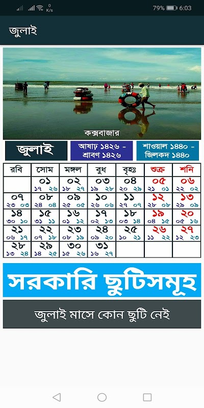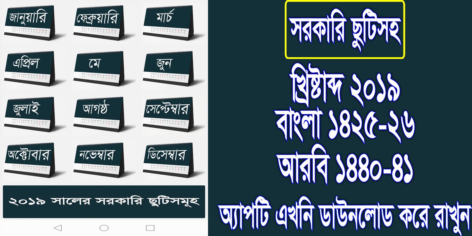 This calendar contains the date of 2019 with government holiday of Bangladesh. It also contain bengali calendar 1425 to bengali calendar 1426 and arabic calendar 1440 to arabic calendar 1441. All this calendar is made for Bangladesh. Only Bangladeshi people should be install this app.