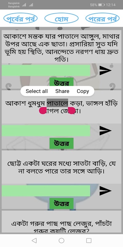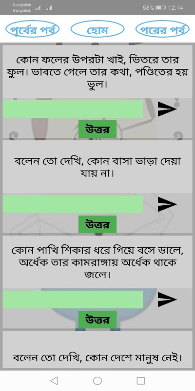 This bangla dhadha app is the best bangla dhadha collection. This bangla puzzle app has new bangla dhadha for the lover of bangla dhadha. This is the latest updated bangla dhadha collection. This bangla dhadha app is with answer of each dhadha with respect to bangla dhadha. All bangla dhadha and bangla dhadha answer is in Bengali language. So you will be able to understand all dhadha easily. By enjoying this bangla dhadha you can enjoy a happy moment with your friends and family by giving challenge to solve this bangla dhadha. I hope you will get a sharp memory by solving this bengali dhadha. In this bangla dhadha book you will get a send button and a answer button. You can send any bangla puzzle to anyone. And also you can check the result of bangla dhadha by pressing answer button.
