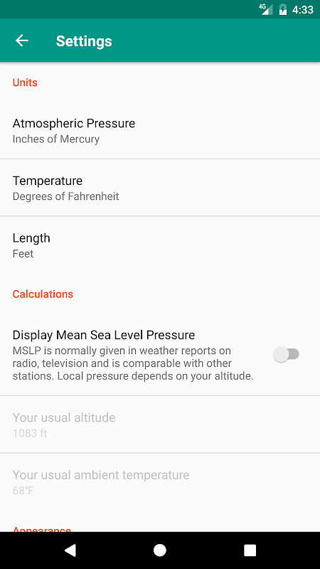 Deze app is makkelijker te gebruiken dan een aneroïde of kwik barometer omdat het de geschiedenis onthoudt en het kan worden gekalibreerd via de gemiddelde luchtdruk op zeeniveau.