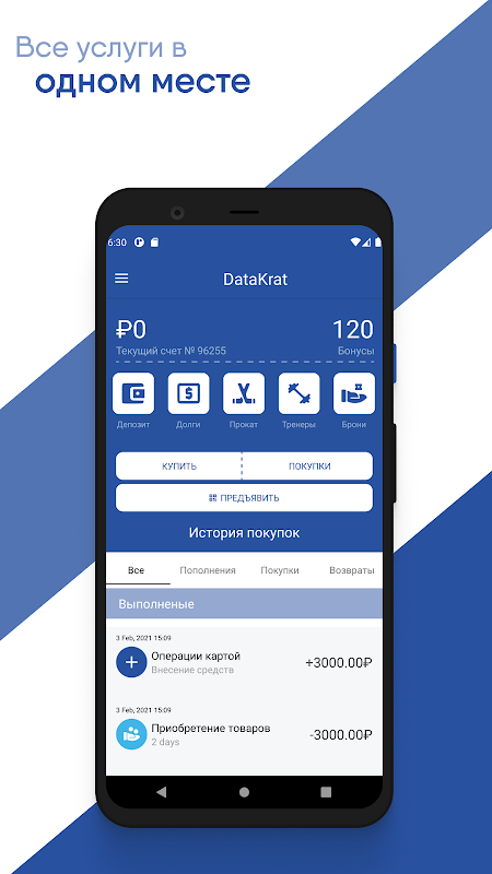 In de applicatie kunt u betalen voor alle services - training met een instructeur, materiaalverhuur, parkeren, ticket of andere eenmalige en gerelateerde services.