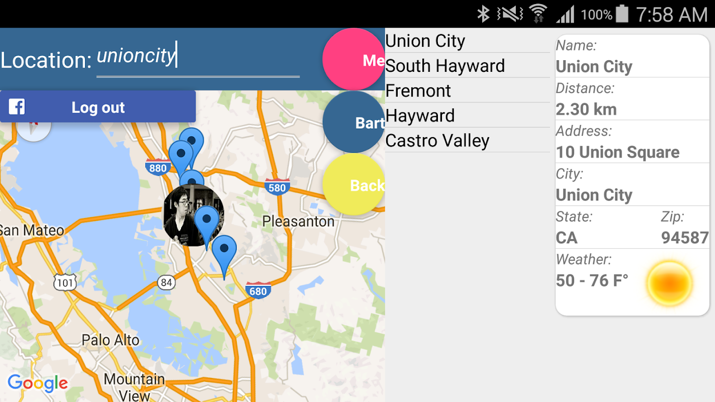 • Find 5 Bart stations the most close to either you or your input location or anywhere of the map you touch;