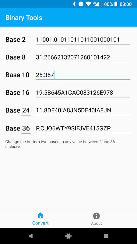 Binary Tools is a small app that can convert numbers from any base between 2 and 36.