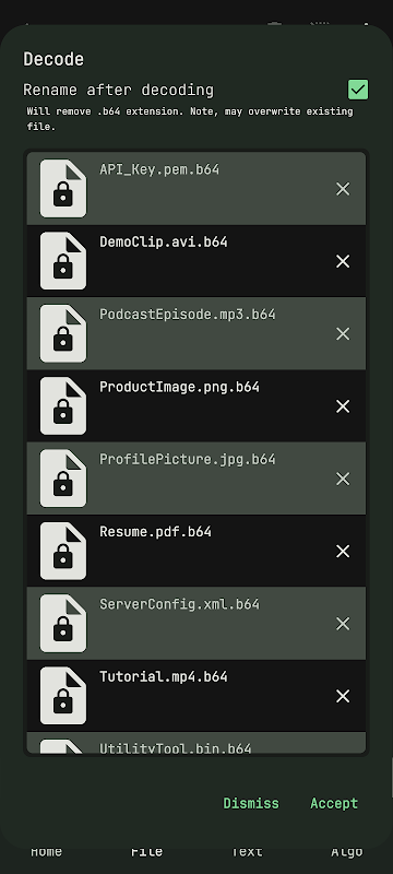 Base64 File Encoder Decoder is een veelzijdige tool ontworpen voor het naadloos coderen en decoderen van bestanden en tekst. Of u nu een ontwikkelaar, data-analist of gewoon iemand bent die regelmatig met gegevenscodering werkt, deze app is op maat gemaakt om efficiënt aan uw behoeften te voldoen.