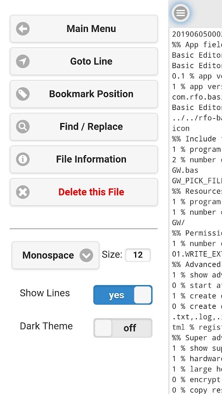 Basiseditor is geschreven met RFO BASIC! voor Android, met behulp van de GW lib en gecompileerd met de Android BASIC! Compiler.