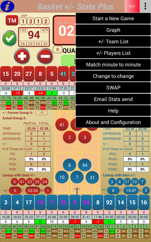 - Het vastleggen van +/- van alle spelers die deelnemen aan het spel, de speeltijd die ze hebben gespeeld en de verdeling van +/- in het scoren en ontvangen door het team gedurende de tijd dat de speler op de baan was.