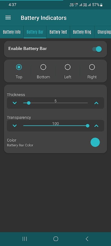 De indicator-app voor batterijniveau biedt u veel opties voor batterij-indicatoren. U kunt een cirkelvormige batterijring of stroombalken toevoegen met veel aanpassingsopties. hiermee kun je het uiterlijk van de powerring of powerbar op je scherm volledig regelen.