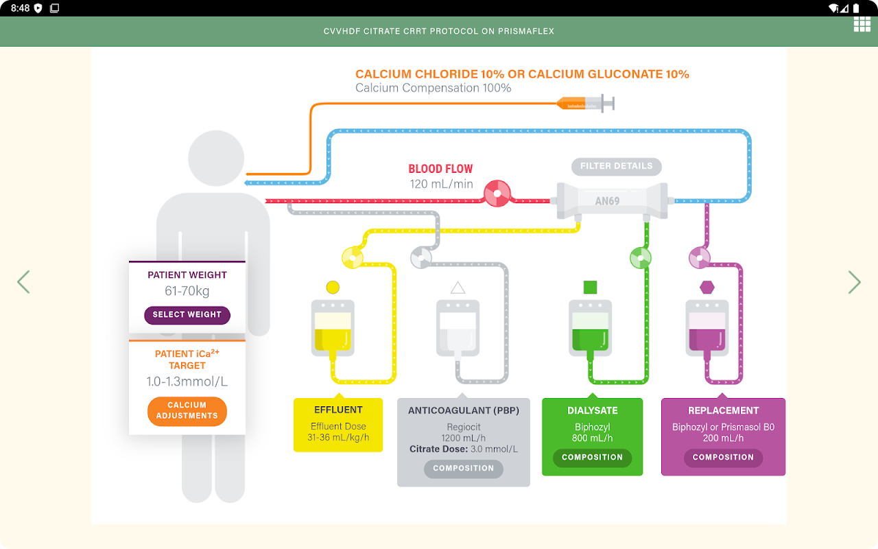 Deze app is bedoeld als richtlijn voor de toediening van CRRT-therapie met behulp van de Vantive Prismaflex-machine en Vantive Hemofiltratie- en Hemodialyse-oplossingen en -sets. Deze app bevat ook richtlijnen voor geavanceerde therapieën zoals regionale citraatanticoagulatie (Regiocit & Biphozyl) en adsorptieve filter (Oxiris). Dit is slechts een richtlijn (gebaseerd op wetenschappelijk bewijs) en beroepsbeoefenaren in de gezondheidszorg moeten hun eigen, onafhankelijke, klinische oordeel vellen wanneer ze besluiten de applicatie te gebruiken.