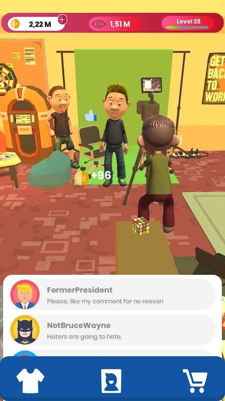 Improve your streamer actions, upgrade your studio, environment and character to gain more followers and money.