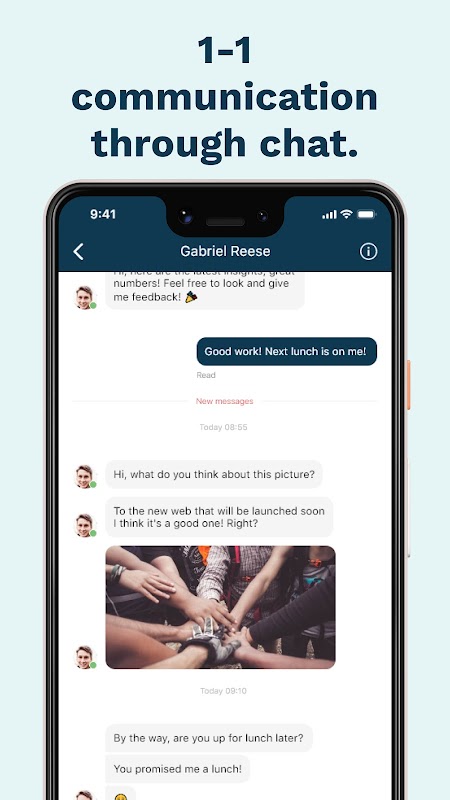 Met de app kun je het laatste interne nieuws lezen, informatie publiceren en je dagelijkse leven op het werk delen. Het geeft ook een goed overzicht van wat er gebeurt en aankomende evenementen. De chatfunctie zorgt voor snelle reacties van je collega's.