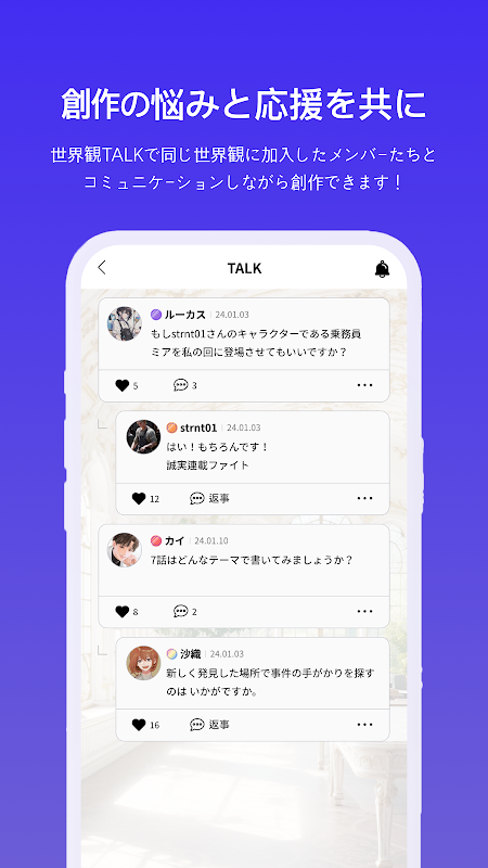 Creëer je eigen verhaal door instellingen toe te voegen in een samenwerkend wereldbeeld. Communiceer met de personages van andere mensen en breid het verhaal uit.