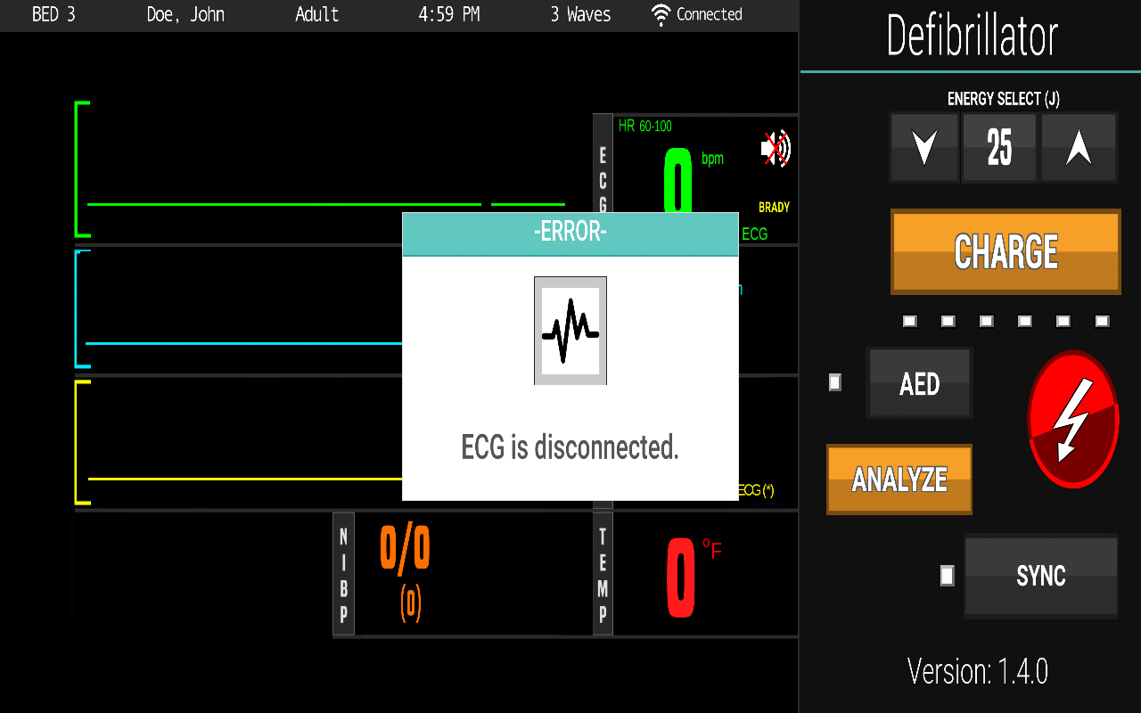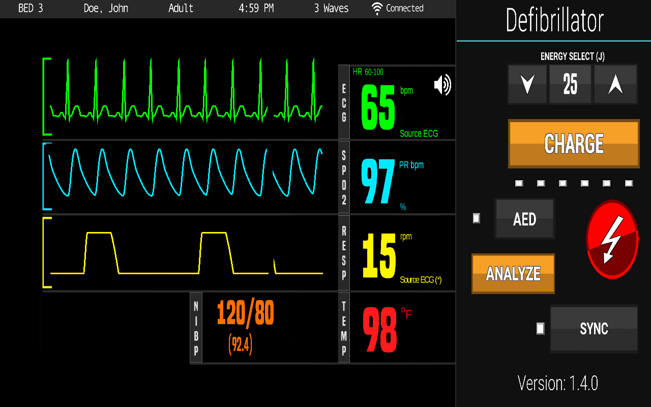 De PerSim ™ -monitor is een realistische defibrillator voor vitale monitors voor PerSim ™. Kenmerken omvatten een verscheidenheid aan hartgolfvormen, waaronder afib, vfib, asystolie, atriumflutter, Mobitz 1 en 2 en nog veel meer. PerSim ™ Monitor heeft ook algemene defibrillatiefuncties zoals AED, handmatige defibrillatie en synchronisatie.