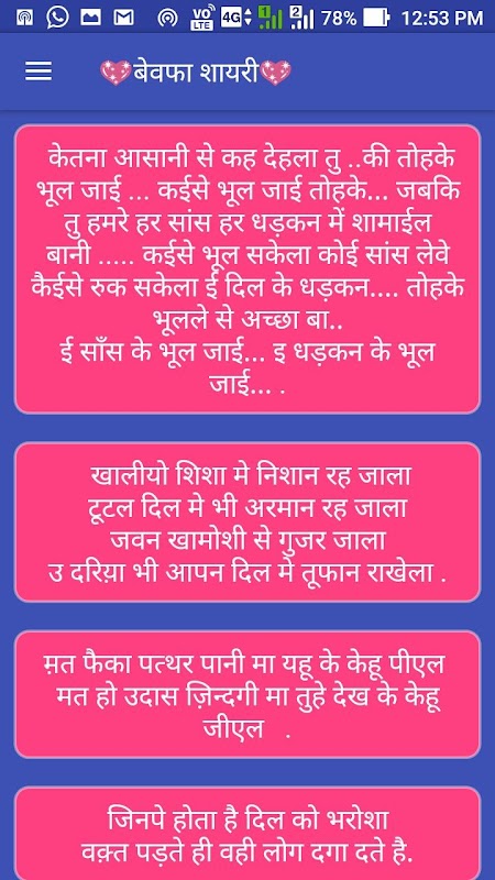 Bhojpuri language is speaking in Bihar, Uttar Pradesh mostly. But now it is world wide famous. In this Application you can read, copy and share on WhatsApp, Facebook and other social site. You will find Bhojpuri Jokes, Bhojpuri Love Shayari, Propose Shayari, Bhojpuri Sad Shayari, Bhojpuri Romance Shayari, Bhojpuri Miss You Shayari, and much more. These Bhojpuri new shayari and jokes topics are much in trending in these days. This App is easy to use and night weight. Below 10 MB. Attractive user interface. You can copy and share it on WhatsApp, Facebook and other social site or Apps.