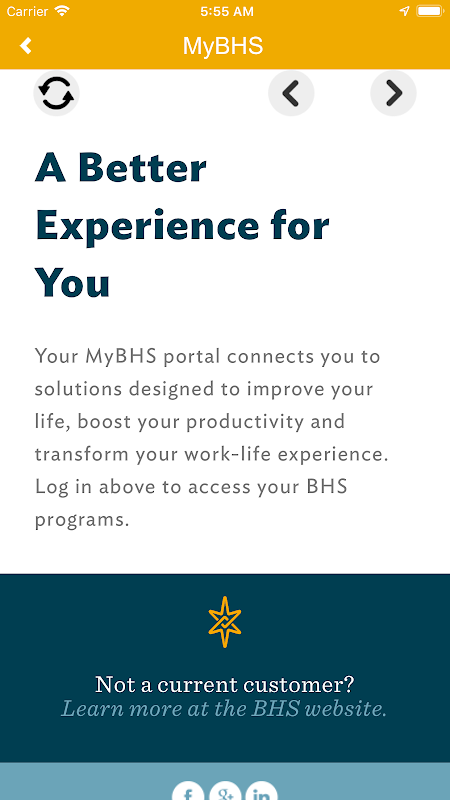 Welkom bij de BHS-app. Deze gratis app verbindt BHS-klanten met oplossingen die zijn ontworpen om uw leven te verbeteren, uw productiviteit te verhogen en uw werkervaring te verbeteren. Met gemakkelijke toegang met één druk op vertrouwelijke, in-de-tijd ondersteuning, zijn we hier wanneer u hulp nodig hebt met werk- of levensproblemen of wanneer u gewoon met iemand moet praten.