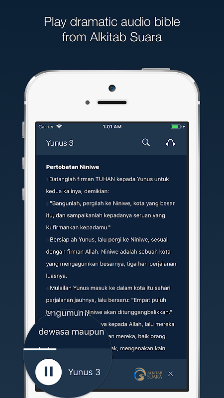 Bibleify adalah aplikasi alkitab offline modern dengan suara dramatis dari alkitabsuara.com dengan fitur sebagai berikut: