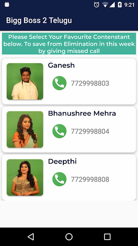2. You can vote your favorite contestant by giving missed call to their assigned mobile number.