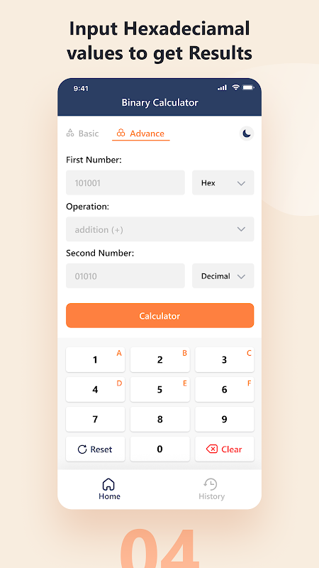 5. In de geavanceerde modus converteert het decimale of andere getallen naar binair voordat een bewerking wordt toegepast.