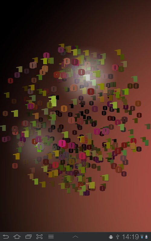 A tree with ones and zeros as leaves. Branches sway slowly and the tree spins smoothly around it's own axis as you scroll between home screens. Tree branches die after a while and fade away, and a new branch is born, growing up from the trunk led by a glowing cursor. As the branch is fully grown it explodes in a light flash and leaves a new 1 or 0 as the leaf.
