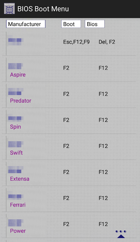 Deze app biedt een lijst met algemene BIOS- en BOOT Options-sleutels per merk en fabrikant.