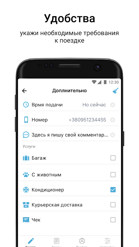 * выбор дополнительных услуг по заказу - возможность указать необходимые для поездки условия, например, перевозка животного