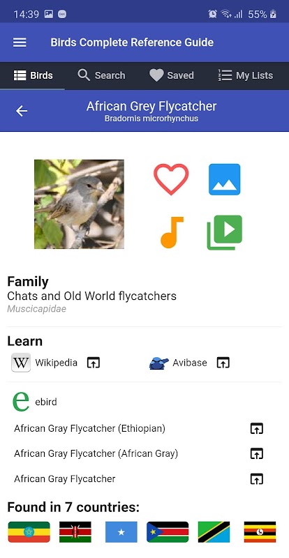 Uitgebreide informatie over elke vogel kan worden gevonden via de Wikipedia-links in elk vogelprofielscherm.