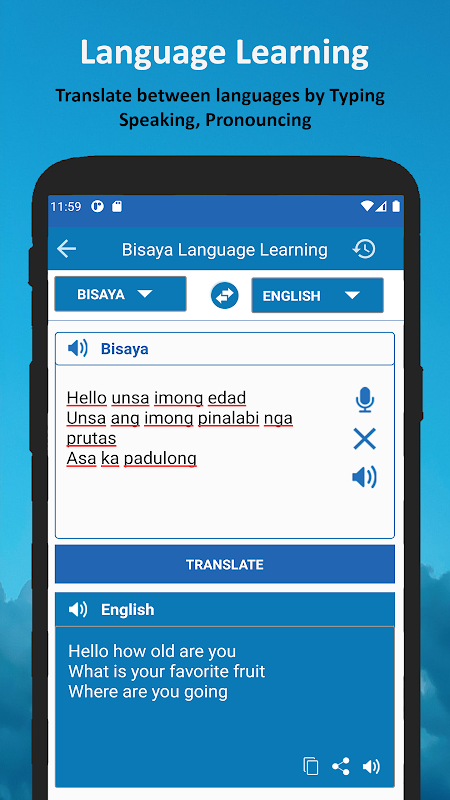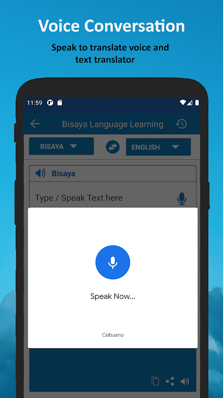 Vertaler Van Bisaya naar Engels taalcursus: alfabet, woordenschat, grammatica, reiszinnen en uitspraak, enz. Bisaya naar Engels Stem Vertaler traint je lees-, luister-, spreek- en schrijfvaardigheden in slechts een paar dagen. Zelf een nieuwe taal studeren met Engels naar Bisaya Vertaler & Bisaya naar Engels Vertaler is echt efficiënt en effectief.