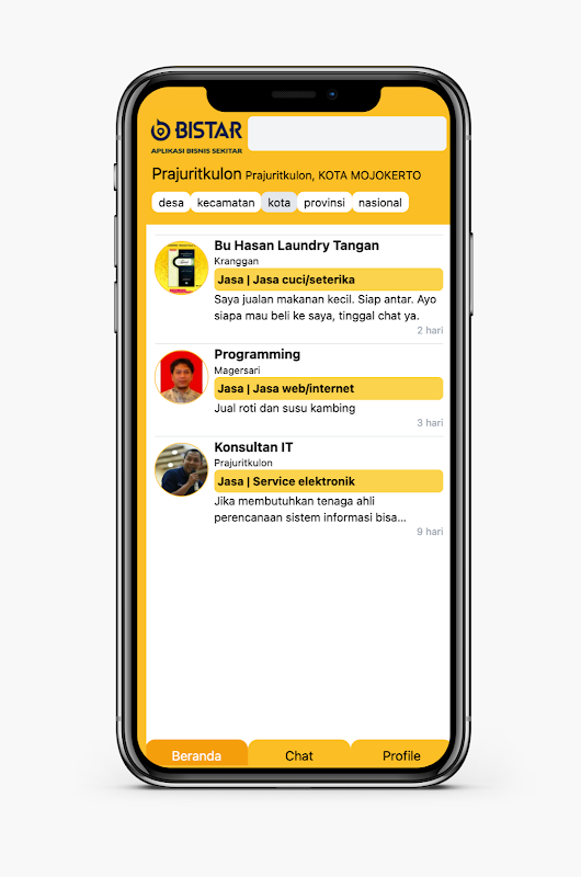 BISTAR adalah sebuah aplikasi untuk mengetahui ada bisnis apa saja di tetangga kita yang ada di desa kita.