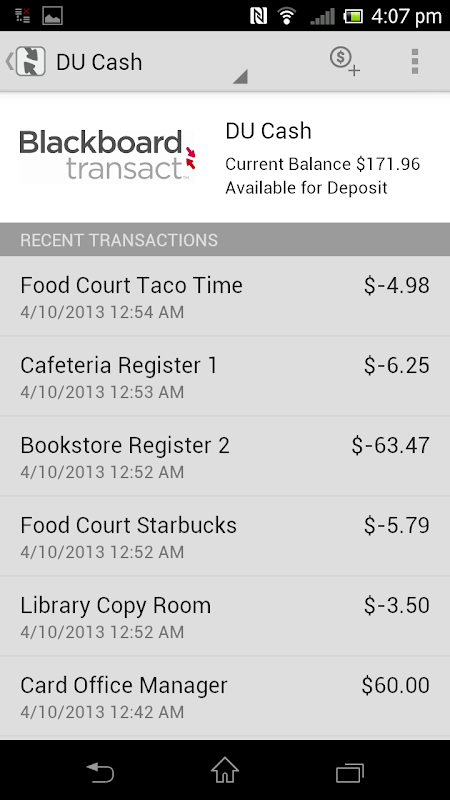 Blackboard Transact Mobile eAccounts application provides quick and easy access to the most popular features of Blackboard Transact eAccounts. Users affiliated with participating institutions can securely manage local campus stored value accounts and ID card status directly through the app. In addition, if enabled, the application can be used as an ID credential to process transactions at NFC capable terminals. Please contact your campus ID card office to verify Bb Transact is supported. A list of campuses currently using Blackboard eAccounts supporting this application is available at http://bbbb.blackboard.com/mobile.
