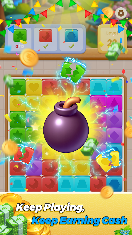 Betreed de wereld van Blob Boom: Tik om kleurrijke blokken te matchen en op te blazen in dit verslavende elimineeravontuur — een logische elimineerervaring met echte beloningen die je kunt laten uitbetalen! Geen in-app aankopen of gokken.