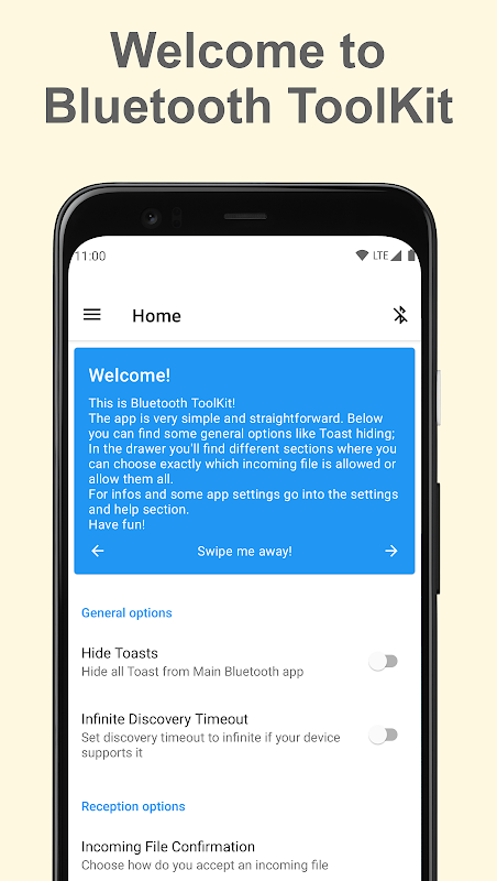 Dankzij Bluetooth ToolKit kun je elk bestand via bluetooth ontvangen, kiezen hoe je op de hoogte wilt worden gehouden wanneer je een bestand ontvangt, verschillende delen materialiseren die door Google zijn vergeten... Dit alles in een schattige en zoete afbeelding! (nu 2.0!)