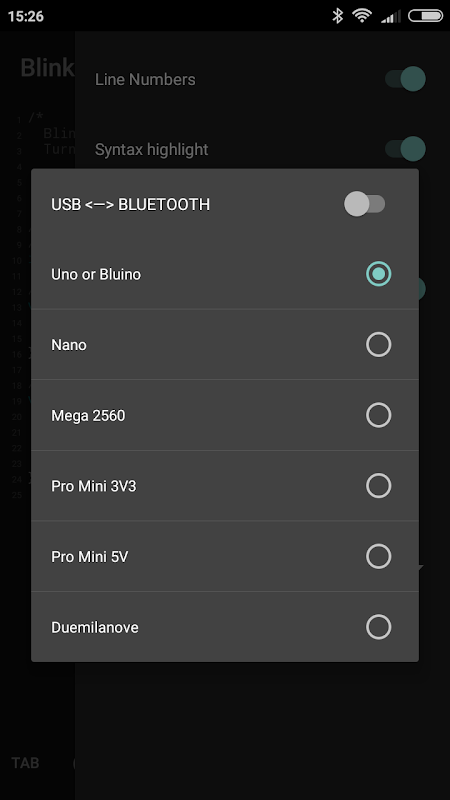 Bluino Loader is een Arduino programmeur software (Arduino IDE) draait op Android, maakt het gemakkelijk om schetscode te schrijven, schets te compileren om een hex-bestand te genereren en te uploaden naar Bluino of verschillende Arduino-kaarten via USB OTG of draadloze Bluetooth.