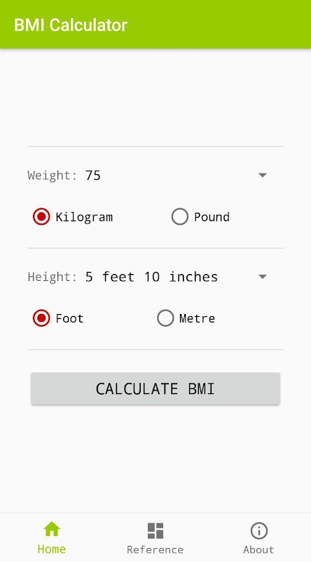 Een eenvoudig, schoon hulpprogramma zonder advertenties om de Body Mass Index (BMI) te berekenen en classificeren.