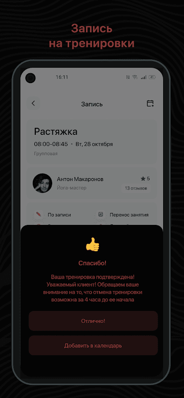 - Ontvang 3 uur van tevoren PUSH-meldingen over aankomende trainingen;