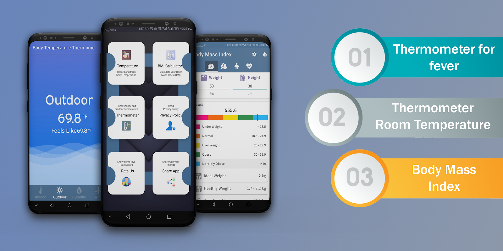 Body Temperature Fever & BMI Calculator App information, gives you the maximum & minimum range of the given values in the app to store the previous records and gives you the information about your body temperature which are given according to the thermometer.