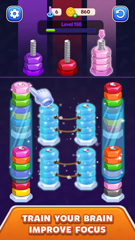 Bolt Sort: Stacking Puzzle is een eenvoudig maar verslavend sorteerspel! Je doel is om noten van dezelfde kleur op bijpassende bouten te stapelen. Volg de regels: