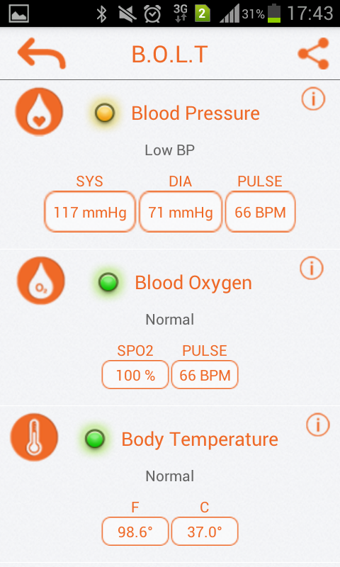The BOLT app with the BOLT device (Please place an order for BOLT device from www.amzbolt.com) allows you to measure and keep track of the following vitals