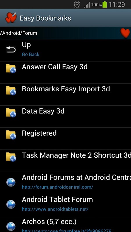 De import functie in de Stock Android Browser Database kon niet draaien op sommige apparaten, in dit scenario het programma werkt met een eigen database waarin de mappen worden beheerd.